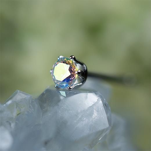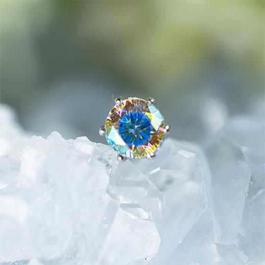 キュービックジルコニアの表面に金属を蒸着させてあるため、角度によって青やピンクや黄色に色を変え、光の当たり具合でメタリックな輝きを見せてくれる石で光遊びを楽しむことができます。