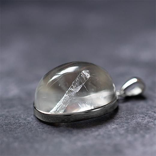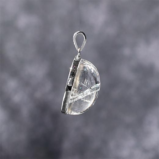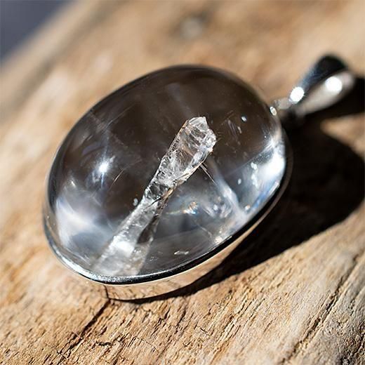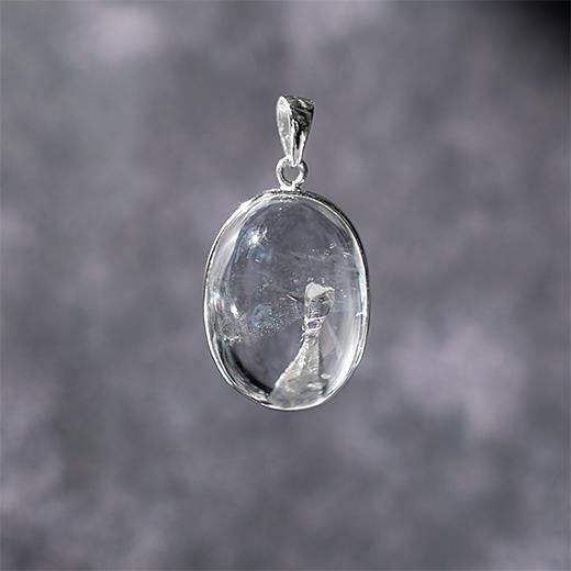 水晶の中に小さな水晶が内包されている状態の石で、小さな水晶が入り込んでいる部分をカットしたルースを使用したペンダントトップとなります。
